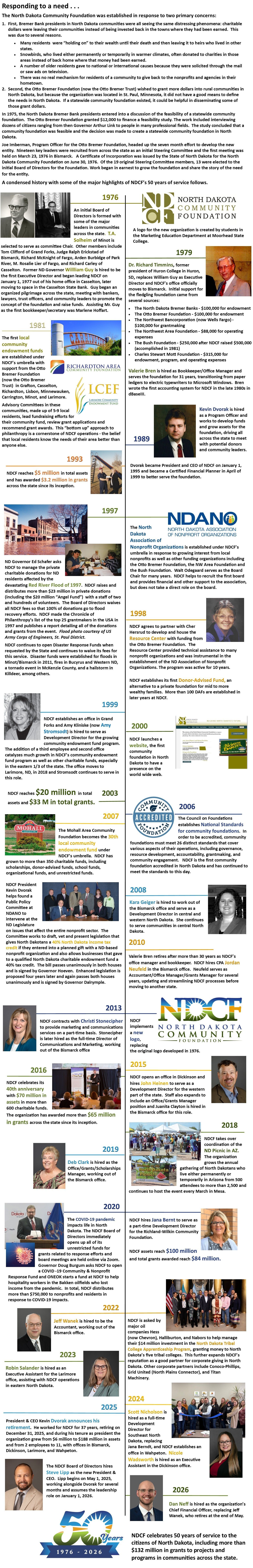 As the North Dakota Community Foundation celebrates its 50th anniversary, we look back at how the organization got started and some of the major milestones in its transition from a fledgling nonprofit to a major funder and partner for North Dakota donors, communities, schools, government agencies, and nonprofit organizations.